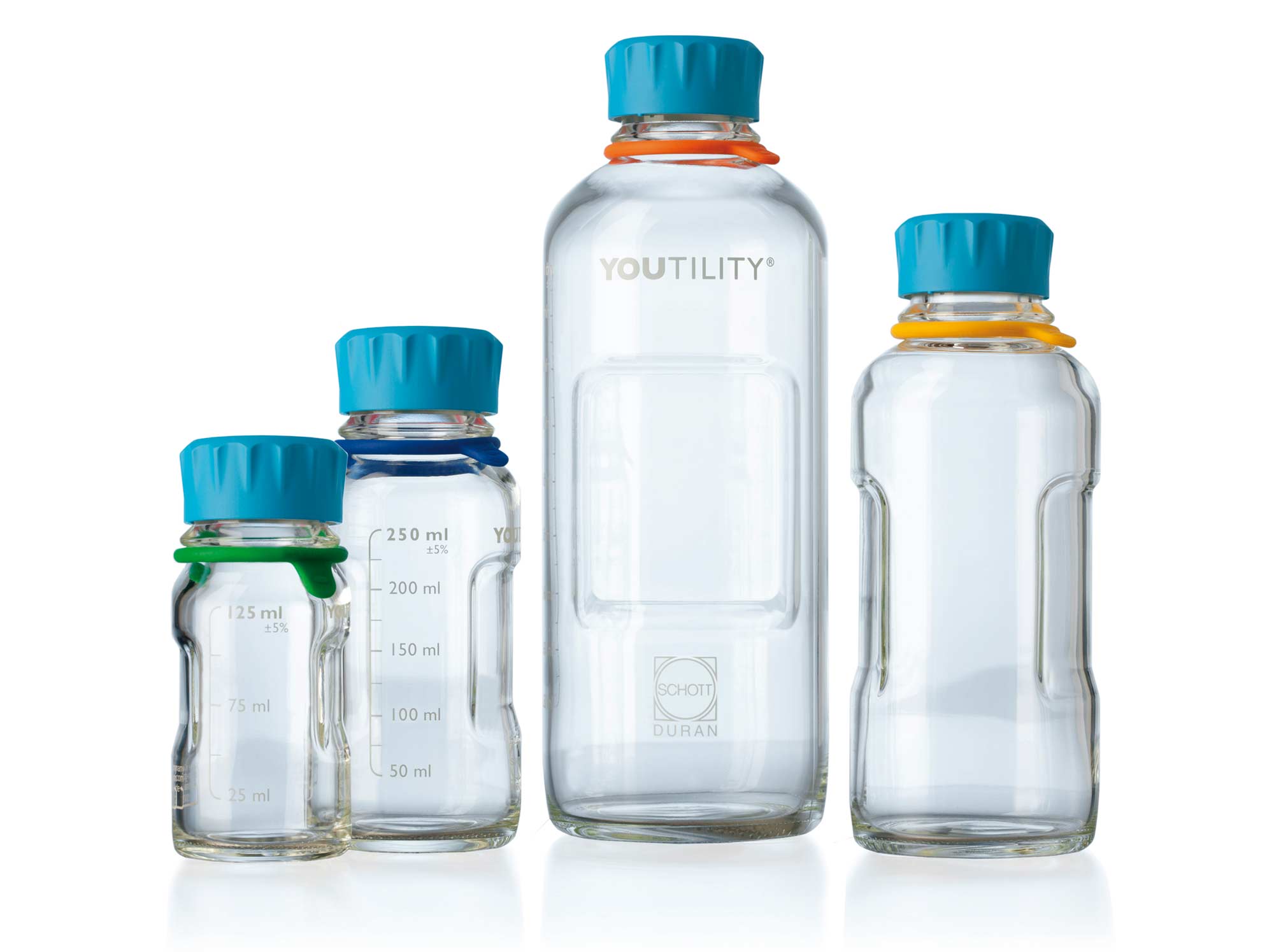 Laboratory bottle with ergonomically designed handle grip and screw cap ensures optimum grip. Colored interchangeable rings for customization and personalization.